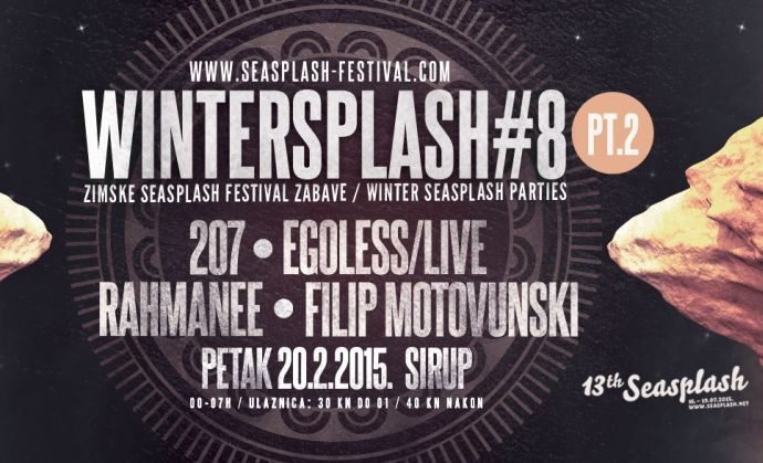 Nakon prve epizode Wintersplasha #8 vraća se na podij zagrebačkog kluba Sirup u Seasplash ritmu! U petak, 20. veljače, predstavit će dio izvođača koji se, uz ostala eminentna imena domaće scene, pojavljuju na kompilaciji ‘Seasplash ritam‘. Kompilacijski album objavljen prošlog ljeta u izdanju izdavačke etikete PDV (004) motiviran je prvim desetljećem Seasplash Festivala, a nakon više od dvije godine priprema pojavljuje se kao album koji po prvi put okuplja presjek domaće scene koja promovira ‘sound system’ kulturu i ‘bass’ glazbu, i koja je nastajala paralelno s pokretanjem festivala, razvijajući se usporedno s godinama njegova održavanja.