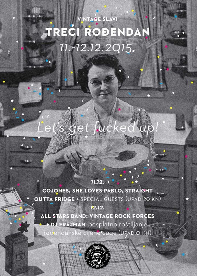 Zemlja se i po treći put okrenula oko Sunca od kada je Vintage Industrial Bar otvorio svoja vrata pa je došlo vrijeme za zajedničku proslavu njihovog 3. rođendana. Rođendanski neredi trajat će dva dana, u petak 11. i subota 12. prosinca. Tijekom ta dva dana slavljeničke koncerte održat će vrsni bendovi i dragi prijatelji kluba – Cojones, She Loves Pablo, Straight Outta Fridge, Mašinko i Vintage Rock Forces. Osim koncerata, Vintage tulumi bit će uveličani i all night long rock ‘n’ roll DJ programom, besplatnim roštiljanjem, besplatnim upadom na drugi dan i litrama cuge koja će biti spuštena na rođendanske cijene.