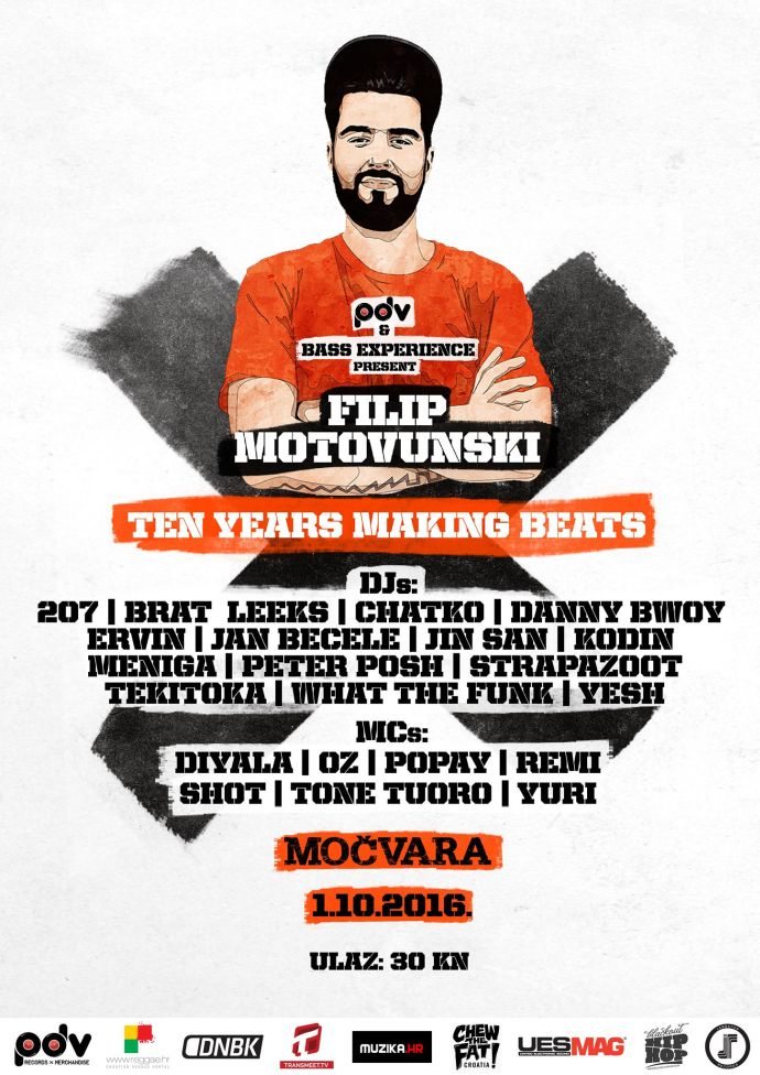 Filip Motovunski jedan je od najpoznatijih domaćih drum’n’bass producenata, a iza sebe ima više od 500 nastupa kod kuće, ali i u inozemstvu. Obilježio je 10 godina aktivnog rada izdavanjem debitantskog albuma ‘Ten Years Making Beats’ koji je izašao 6. svibnja pod okriljem PDV recordsa. Dvostruki CD sadrži gotovo sve Filipove pjesme, na prvom se nalazi izbor od 15 najboljih autorskih radova, a drugi CD sadrži mix sa čak 37 pjesama i remixeva. Osim dvostrukog CDa, sastavni dio izdanja je i free download card koji vodi na link s mixom iz drugog CD-a prožetim ‘shoutovima’ aktivnih ljudi sa scene, Filipovih prijatelja i suradnika. Album ‘Ten Years Making Beats’ sadrži gotovo sve podžanrove drum and bassa, od junglea, deepa i neuro funka do nabrijanih jump up traka, ali i nekoliko hip hop/drum step stvari među kojima i dvije pjesme Filipovog bivšeg rap banda PCP.