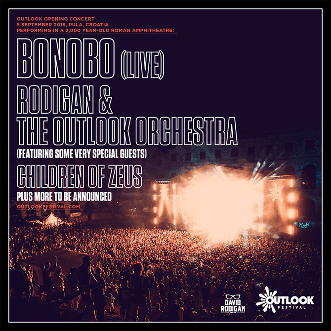Outlook – najveći svjetski festival bass glazbe i soundsystem kulture ulazi u svoju jedanaestu ediciju. ‘Fešta’ tradicionalno započinje spektakularnim koncertom u dvije tisuće godina staroj pulskoj Areni. Ove su godine čast otvorenja dobili Rodigan & The Outlook Orchestra, Children of Zeus i – Bononbo (LIVE)!