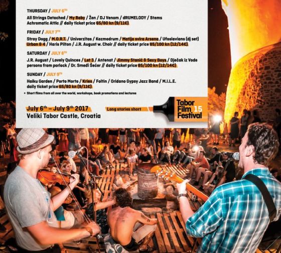Jubilarno 15. izdanje Tabor Film Festivala koje će se održati od 6. do 9. srpnja u dvorcu Veliki Tabor i ove će godine imati bogati filmski program u domaćoj i stranoj konkurenciji. Glazbeni dio festivala osvježen je s dva nova headlinera, a to su Jimmy Stanić & Sexy Boys i sinjski M.O.R.T. kojima će se pridružiti još Foltin iz Makedonije te Slovenci Ufoslavians (DJ set) i Haris Pilton.